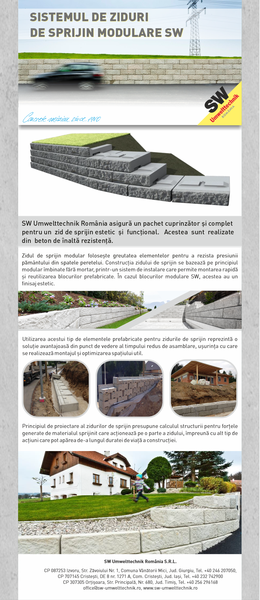 Dezvoltăm și producem piese prefabricate din beton pentru construcția și extinderea infrastructurii terestră și subterană. În fiecare zi conectăm mii de oameni din toate colțurile țării și construim ceea ce are nevoie o țară pentru dezvoltare și funcționare. Inițial fondată ca o companie de familie, am crescut și ne-am extins activitatea în nouă locații din Austria, Ungaria și România. Credem în schimbare și ne folosim experiența pentru a modela viitorul în armonie cu natura.